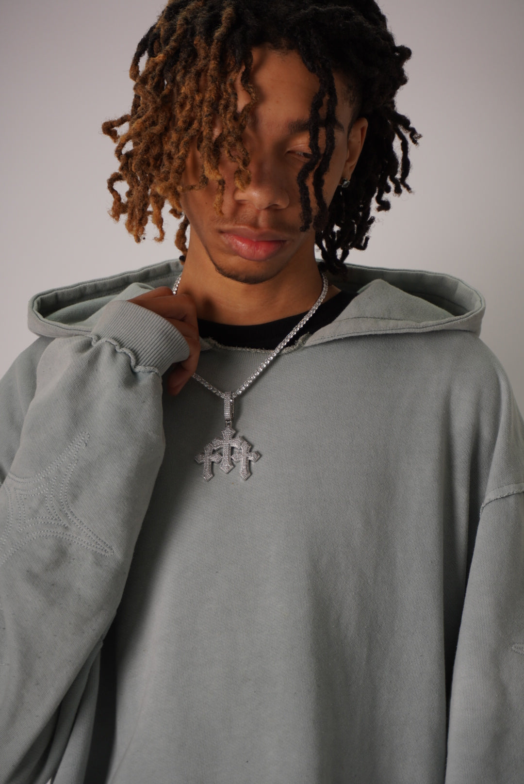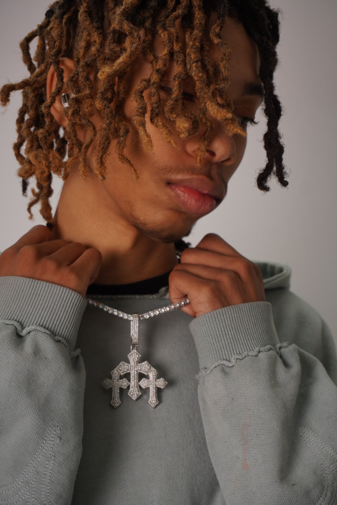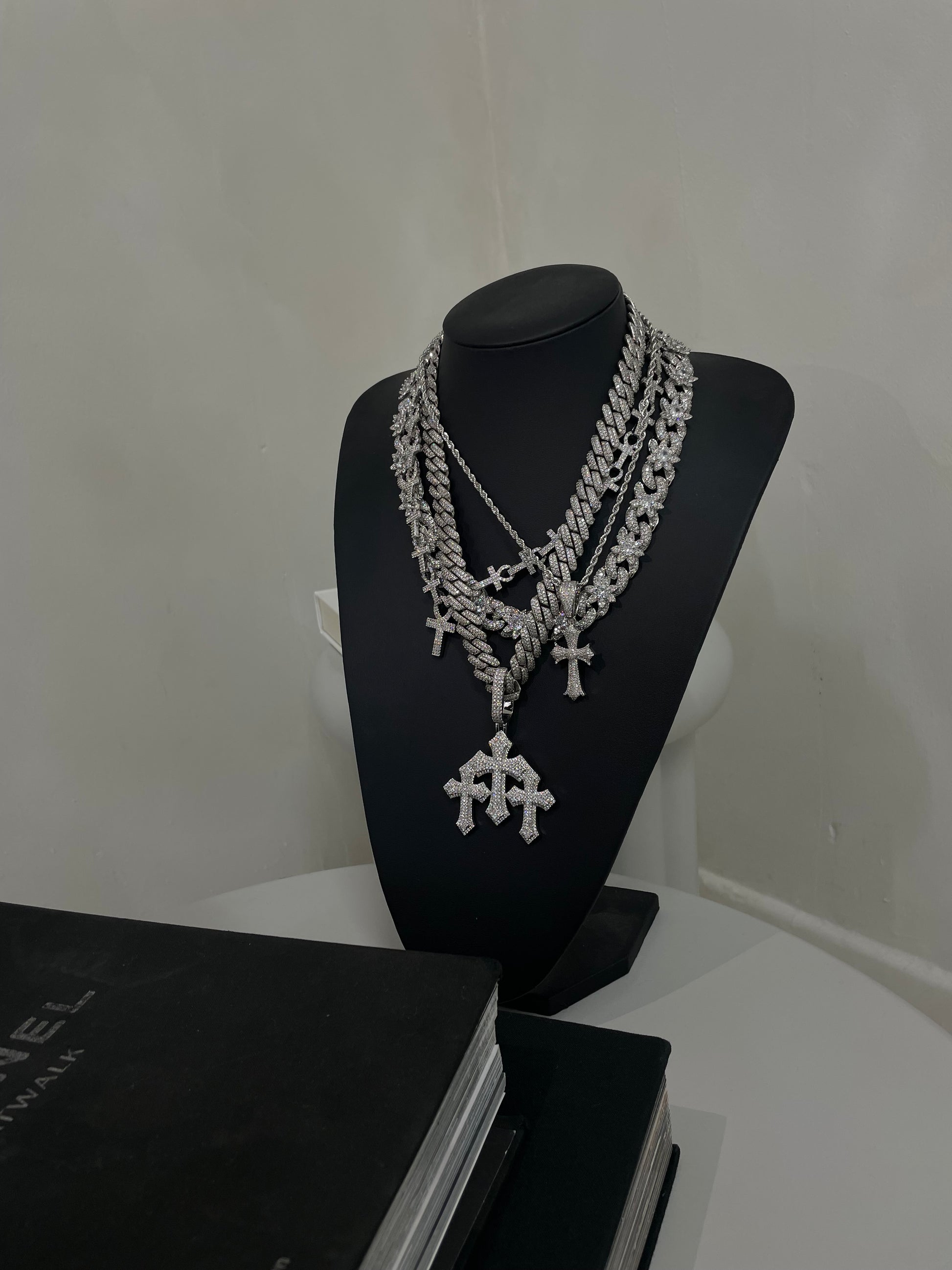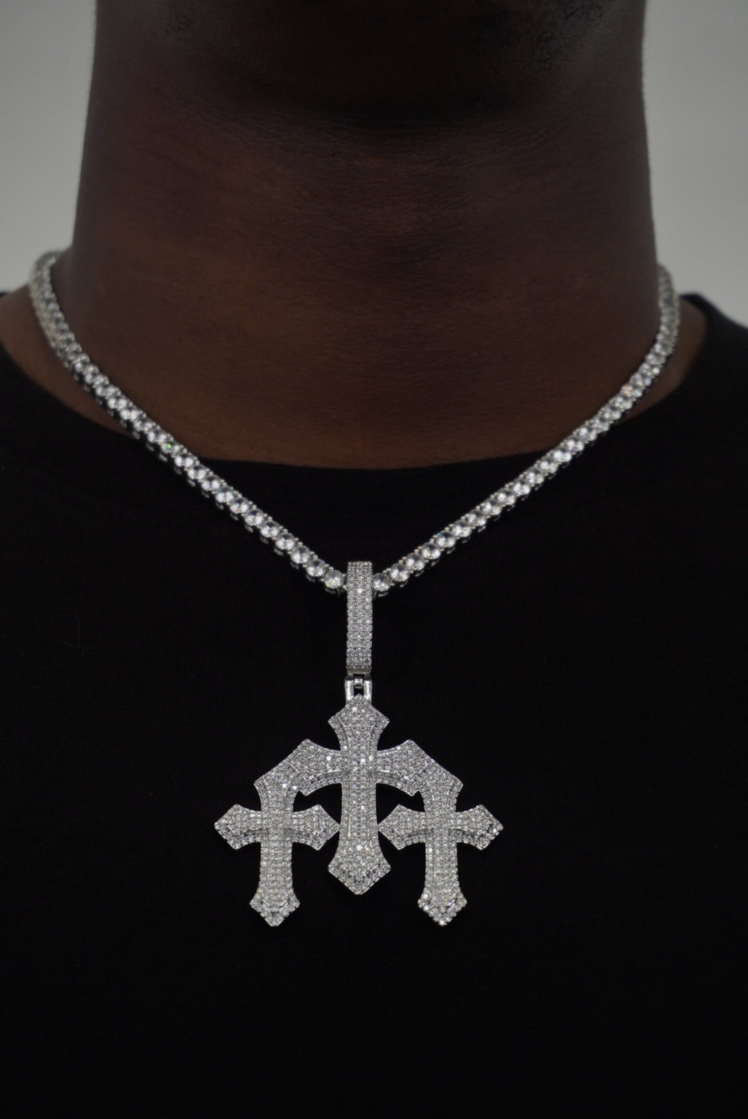Expertly crafted with handset stones, the DB Triple Cross Pendant boasts a unique and eye-catching design. Paired with the sleek and stylish Miami Cuban Chain and Tennis Chain, this pendant exudes confidence and sophistication. Elevate your style with this must-have accessory.